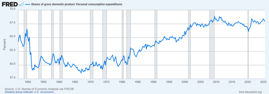 Consumer spending accounts for roughly two-thirds of U.S. economic output. No other major economy in modern history has sustained a consumption share this large for so long.